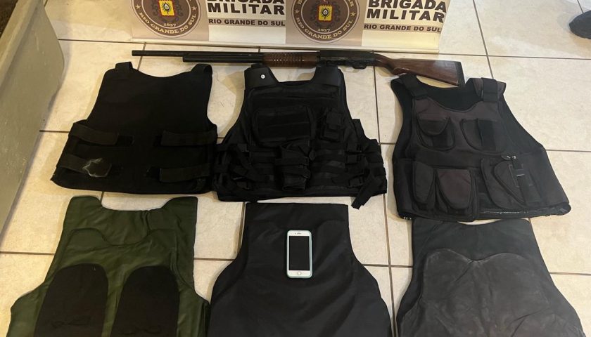 Além de espingarda calibre 12, foram encontrados três pares de coletes balísticos, três capas de coletes pretas, duas toucas ninja e um aparelho celular