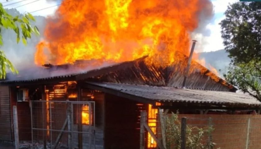 Fogo consumiu casa de madeira no bairro Linha Café neste domingo (20); não houve feridos