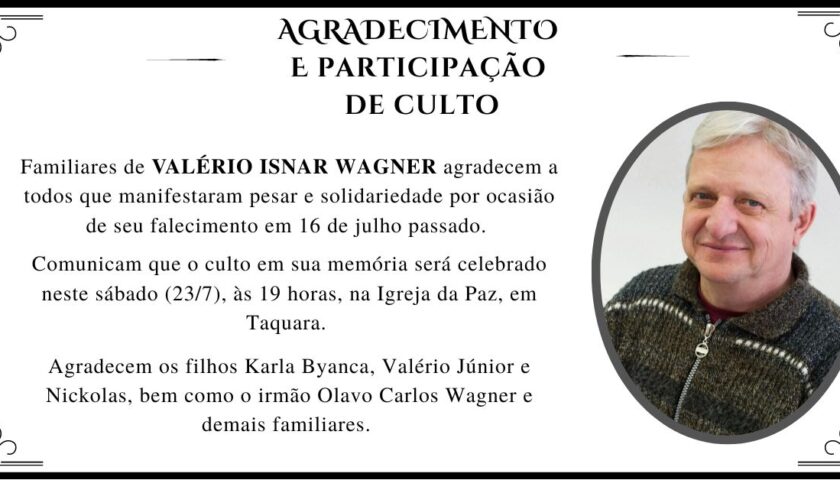 Agradecimento e participação de culto | Valério Isnar Wagner