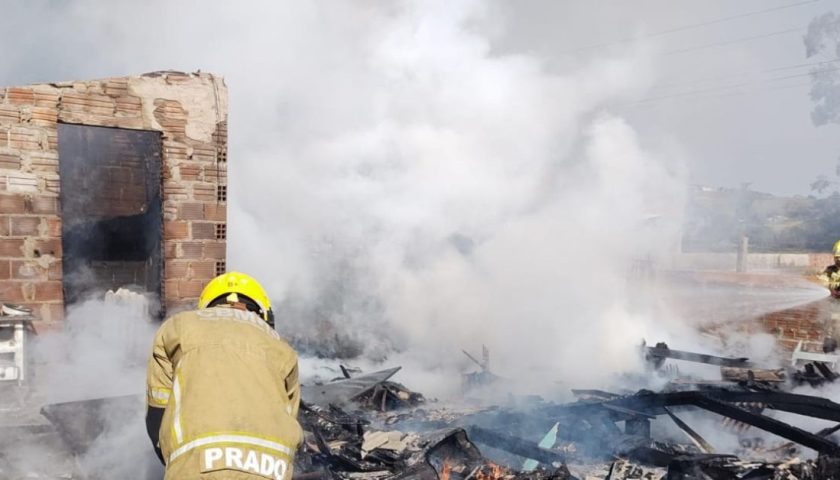 Imóvel foi destruído na manhã desta quarta-feira (2); morador não estava no local, informam os Bombeiros