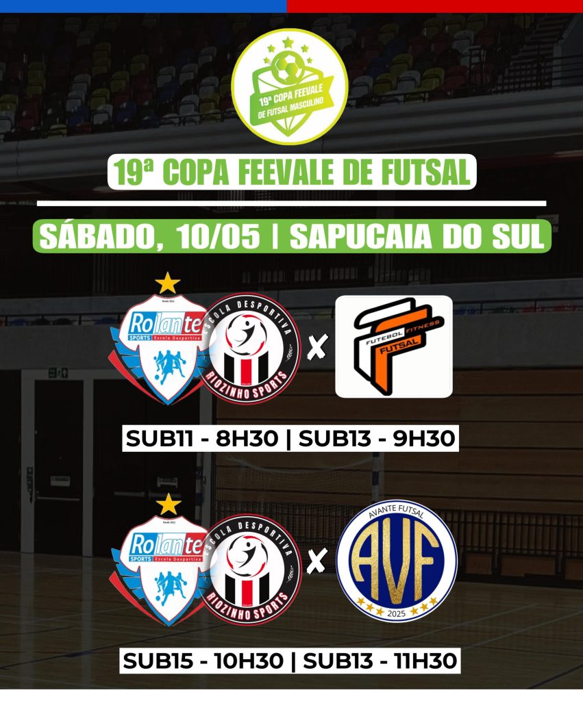 A equipe Rolante Sports/Riozinho Sports participará da 7ª rodada da 19ª Copa Feevale de Futsal no próximo sábado, 10, no Ginásio Municipal Kurashiki, em Sapucaia do Sul, a partir das 8h30.