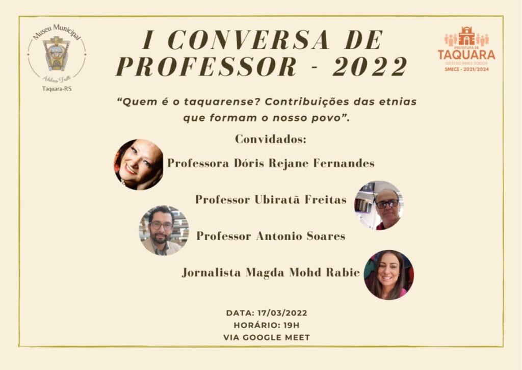 A 1ª Conversa de Professor de 2022 terá a participação da professora de História da Faccat Dóris Rejane Fernandes; do professor de História do Estado, Ubiratã Freitas; do diretor do Museu Arqueológico do Rio Grande do Sul – Marsul, Antônio Soares e da jornalista Magda Mohd Rabie, que falará sobre a descendência árabe em Taquara. O evento será mediado pelo historiador Maicon Rodrigues e pela coordenadora pedagógica da Smece, Taís Oliveira Martins.