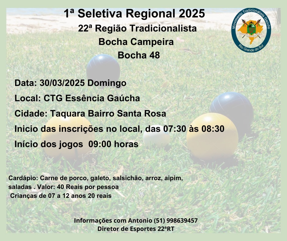No próximo domingo, dia 30 de março, o CTG Essência Gaúcha, no bairro Santa Rosa, em Taquara, será palco da 1ª Seletiva Regional 2025 de Bocha Campeira e Bocha 48. O evento, que reunirá tradicionalistas da região, tem como objetivo selecionar os competidores que representarão a 22ª Região Tradicionalista nas próximas etapas do campeonato.