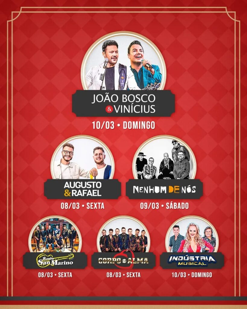 A Festa da Cuca terá shows com João Bosco & Vinícius; Augusto & Rafael; Nenhum de Nós; San Marino; Corpo e Alma; e Indústria Musical
