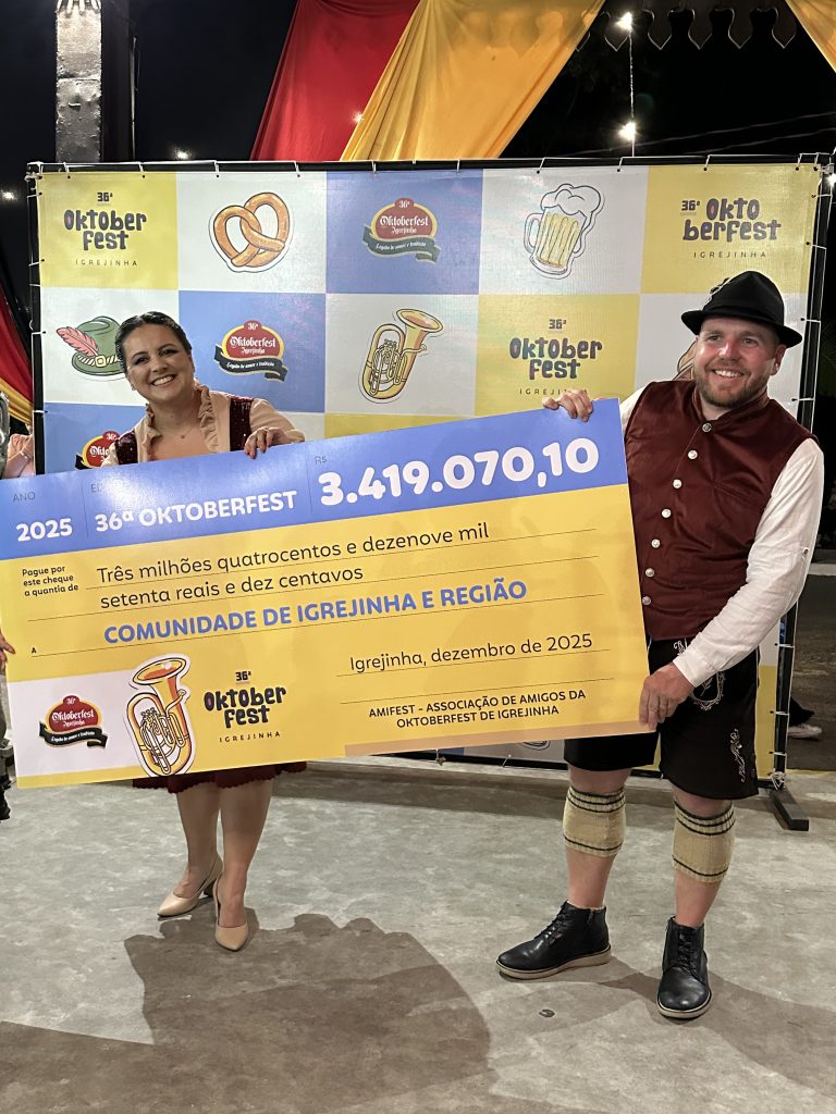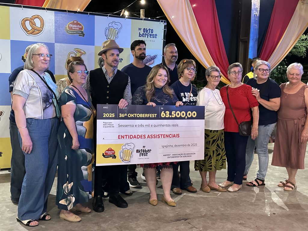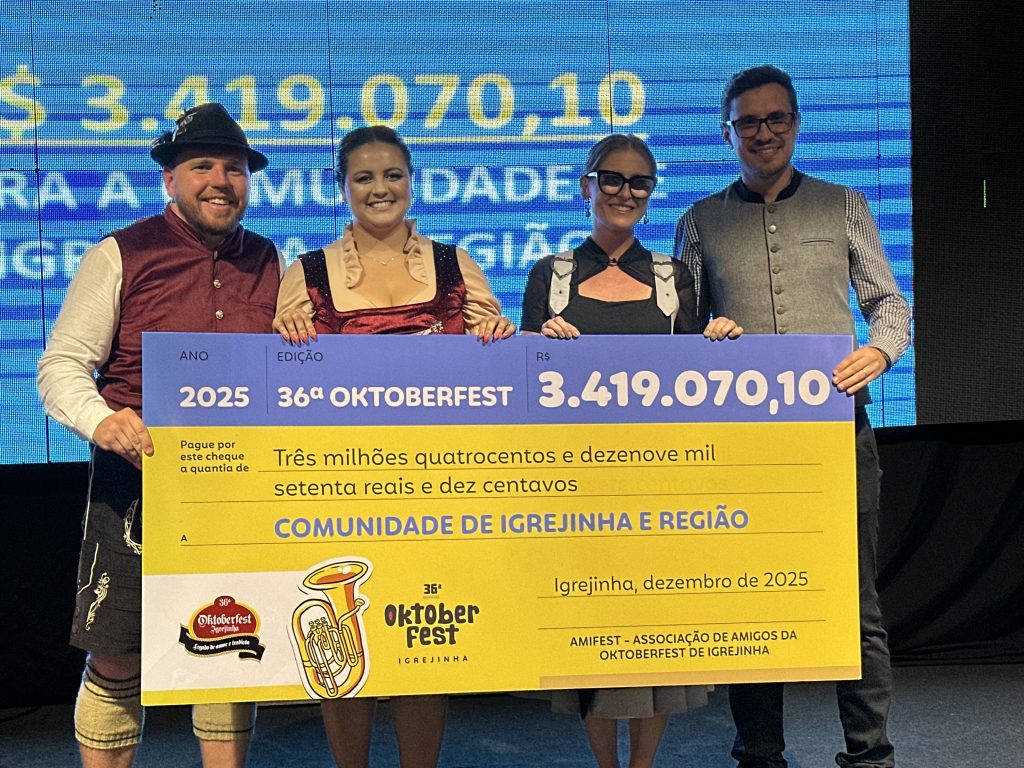 Voluntariado, tradição e resultados positivos marcaram o encerramento da 36ª Oktoberfest de Igrejinha nesta quinta-feira (11). Durante a Festa da Colheita, a Associação de Amigos da Oktoberfest de Igrejinha (Amifest) celebrou os recursos financeiros gerados pela edição de 2025, apresentando o montante que retornará diretamente para ações sociais na região. Ao todo, foram arrecadados R$ 3.419.070,10, valor que será repassado a 89 instituições que atuam em áreas como saúde, segurança, educação e cultura. A celebração, realizada no Pavilhão do Kerb, reuniu voluntários, parceiros, autoridades e comunidade, com shows da Banda Brilha Som e Porto do Som.