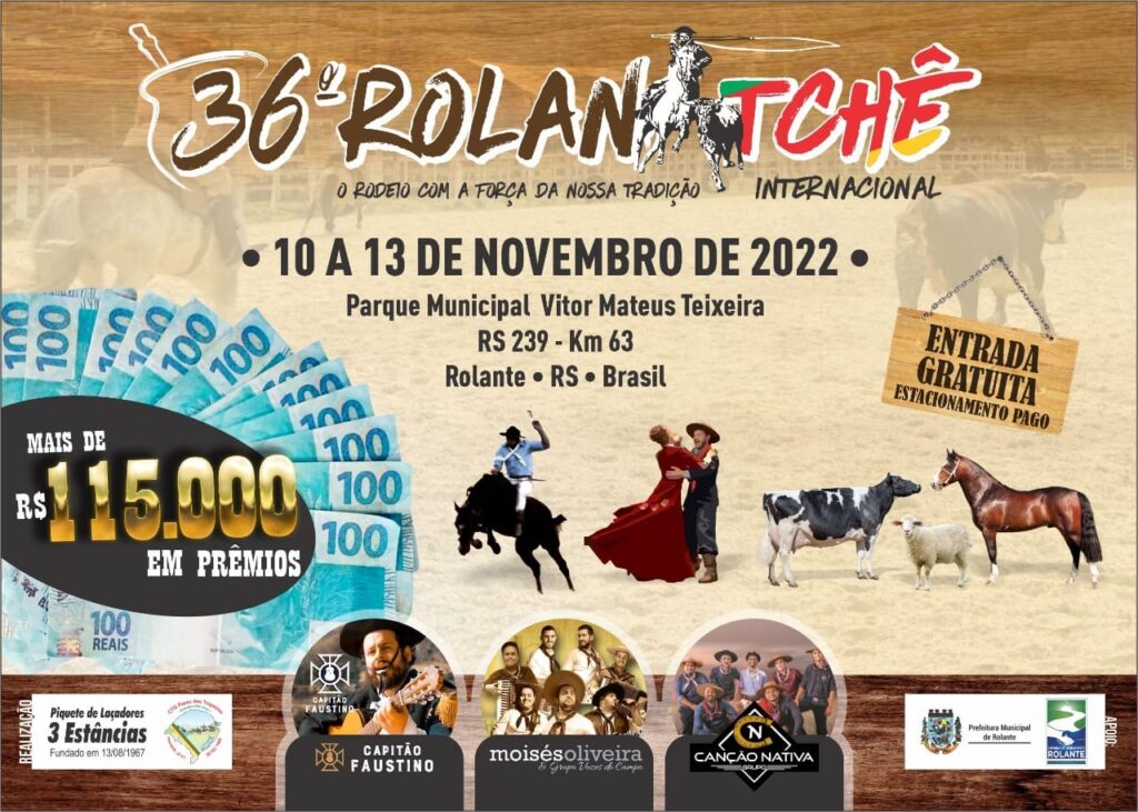 Organizado este ano pelo Piquete de Laçadores Três Estâncias, o 36º Rodeio Crioulo Internacional (Rolantchê) iniciou na quinta-feira (10). A expectativa é de que, até domingo (13), o Parque Municipal Vitor Matheus Teixeira, em Rolante, receba a visita de 20 mil pessoas.