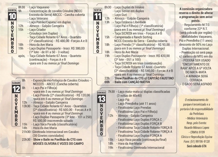 Na manhã de sábado (12), a partir das 8h30min, a Rádio Taquara FM 105.9 estará transmitindo o seu programa “Rio Grande Encanto” diretamente do local do 36º Rolantchê. A transmissão tem o oferecimento da Prefeitura Municipal de Rolante, Faculdades Integradas de Taquara (Faccat) e Lavanderia Gaúcha.