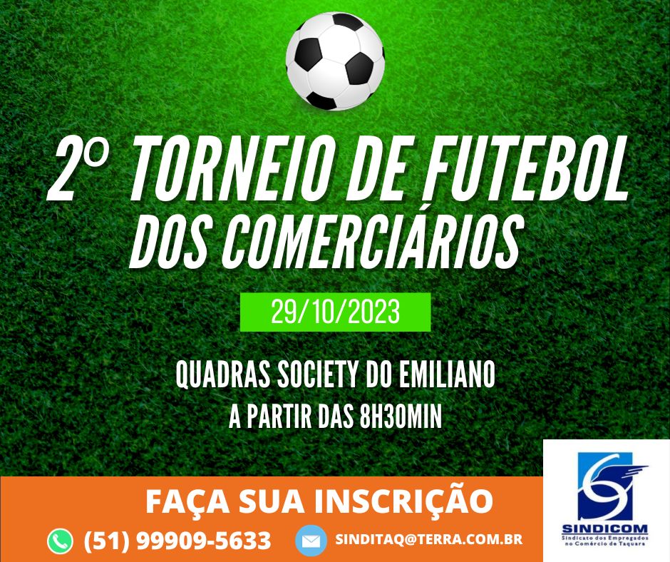 O 2º Torneio de Futebol dos Comerciários do Vale do Paranhana, alusivo ao Dia do Comerciário, celebrado no dia 30 de outubro, será realizado no dia 29 de outubro (domingo), a partir das 8h30min, nas Quadras Society Emiliano, localizadas na Avenida Sebastião Amoretti, 2980, no Bairro Santa Rosa, em Taquara.