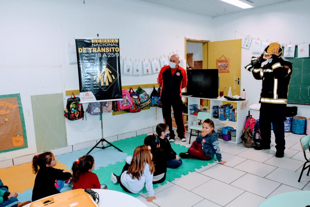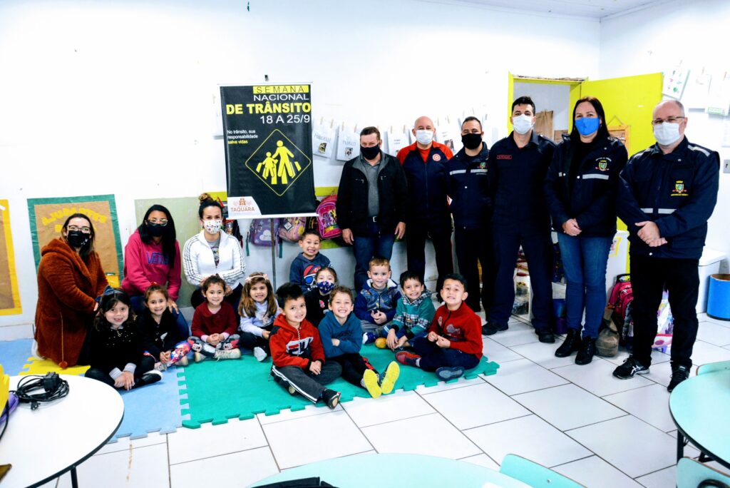 Alunos do pré da Escola Municipal de Educação Infantil Vovó Domênica, no bairro Medianeira, em Taquara, receberam na manhã desta terça-feira (21), representantes da Diretoria de Trânsito e do Corpo de Bombeiros. A ação integra as atividades alusivas à Semana Nacional de Trânsito (SNT), comemorada entre os dias 18 e 25 de setembro, trazendo o tema “No trânsito, sua responsabilidade salva vidas”. Pela tarde, recebem a visita a EMEF Rosa Elsa Mertins e a EEEF Tristão Monteiro.