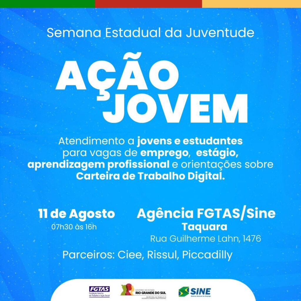 Nesta sexta-feira (11), com o objetivo de contribuir com a inserção dos jovens da região no mercado de trabalho, a agência do FGTAS/Sine de Taquara irá promover a Ação Jovem, no horário das 7h30min às 16h.
