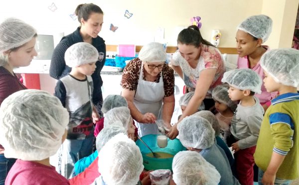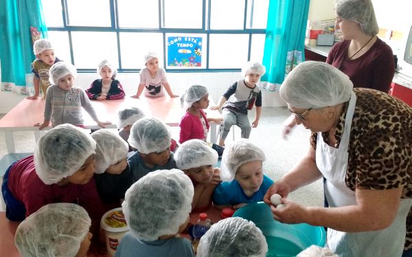 Dentre os diversos projetos desenvolvidos pela Escola Municipal de Educação Infantil Vovó Arlete, de Taquara, um dos que está sendo muito apreciado pelos alunos do maternal dois é o que tem como protagonista o Ovo. Na semana passada (30/8), a turminha recebeu a vovó Josefina Maria Descovi Botton, que apresentou o alimento de uma forma diferente, fazendo bolachas caseiras. Vovó Josefina é avó do aluno, Erick Vicenzo Vianna Botton. “É um momento muito alegre e especial pra mim poder compartilhar um pouquinho da minha experiência com eles”, salienta.