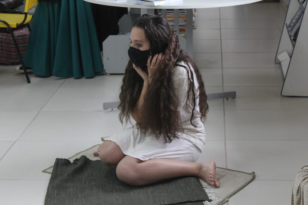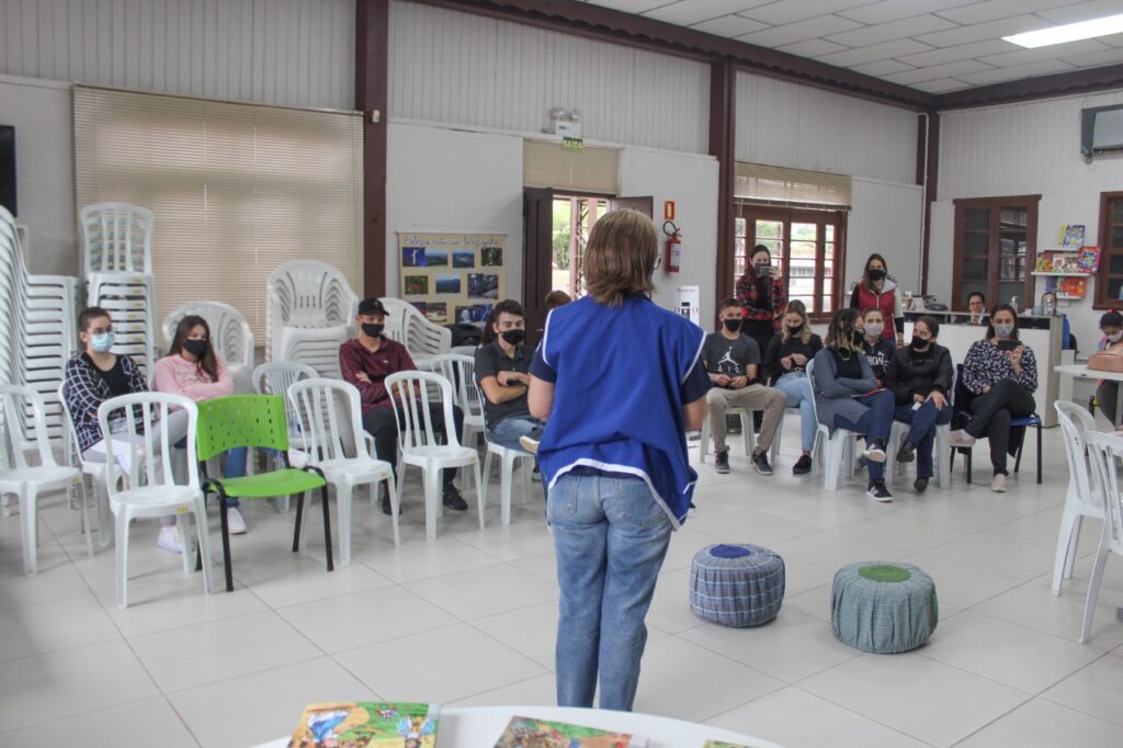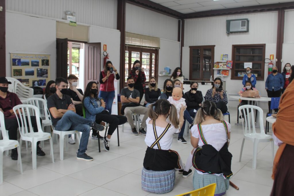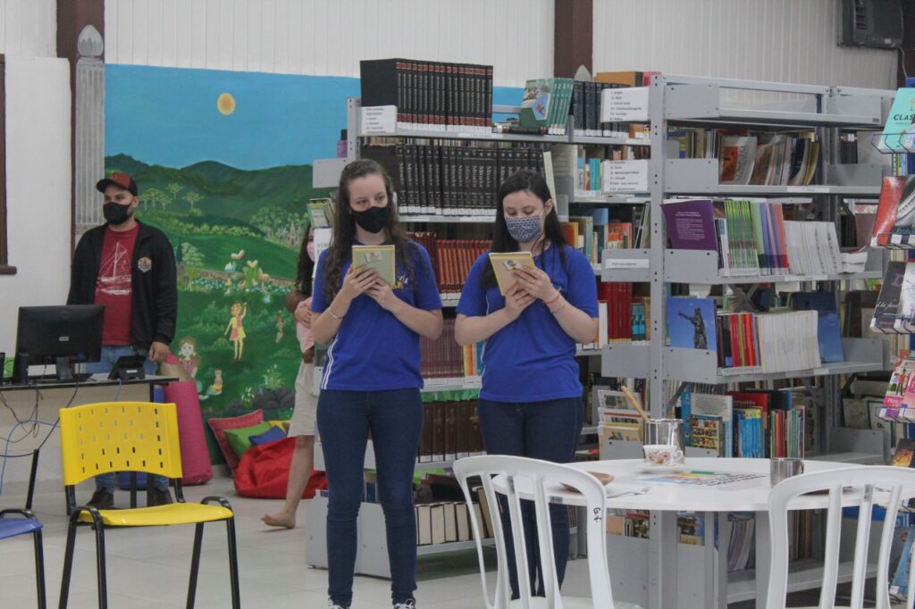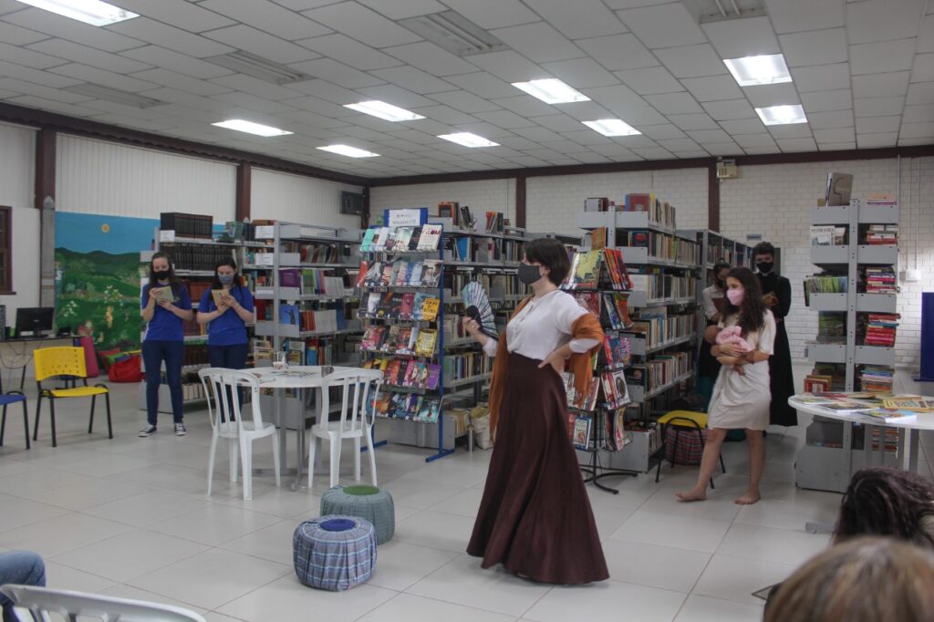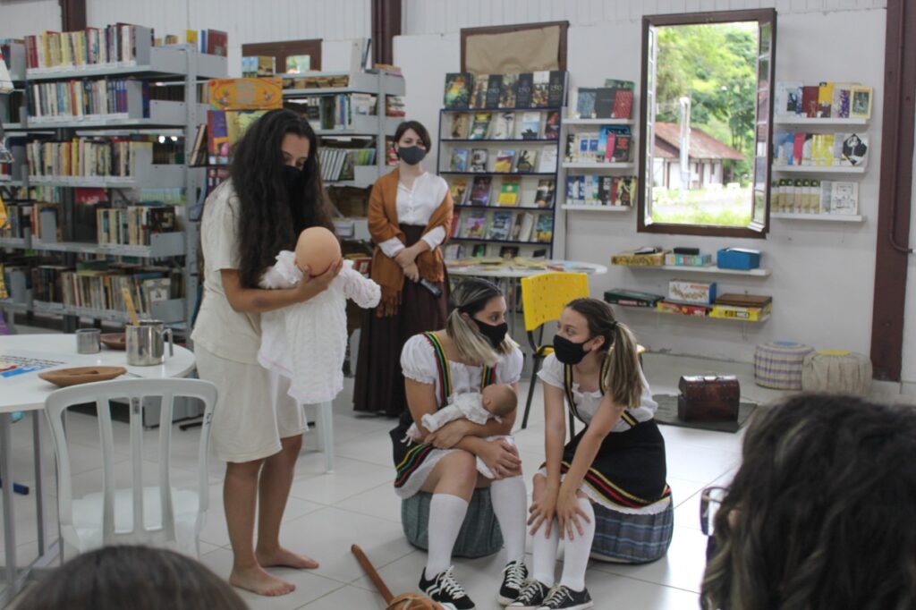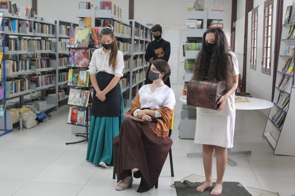 Em seguida, os alunos das turmas 303 e 304 apresentaram as construções que fizeram em sala de aula. Uma parte dos estudantes dramatizou o conto “Negrinha”, de Monteiro Lobato, que retrata a vida da personagem Negrinha, que sofria com o racismo e a sociedade patriarcal de sua época. Participaram da encenação os alunos ngelo da Rosa, Letícia Hehn, Letícia Camargo, Luisa D Ávila, Eduarda Cézar, Isadora Bublitz, Fernanda Rheinnheimer, Kamilly e Eduarda Volkweis.