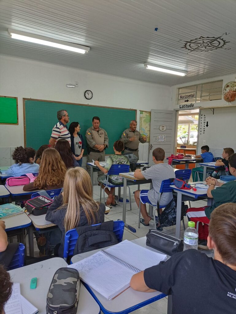 Durante a visita desta quarta-feira, os policiais militares que integram a Patrulha Escolar da 2ª Cia Independente, por meio do Pelotão de Taquara, ministraram palestra aos alunos da Escola Municipal de Ensino Fundamental (EMEF) Júlio Maurer, abordando temas como conscientização sobre o comportamento a ser adotado em via pública no deslocamento de casa até a escola, e também no interior do estabelecimento de ensino, entre outros.