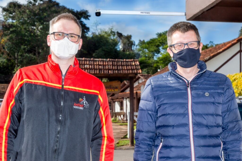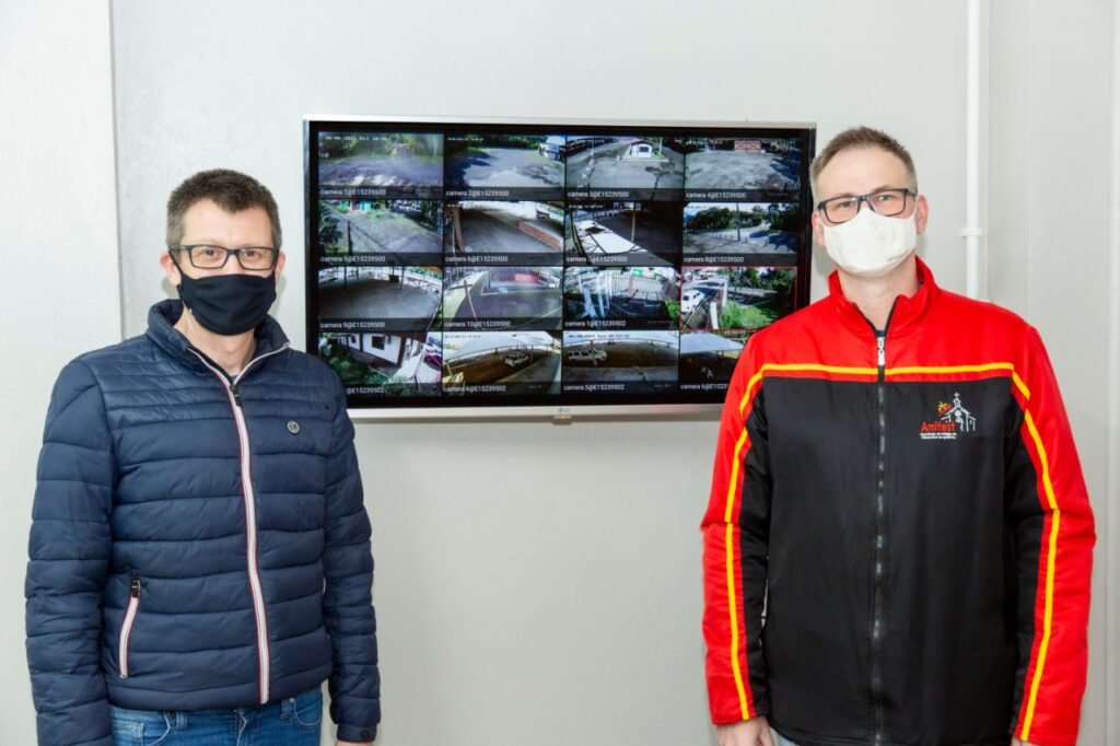 Nas fotos, o momento da entrega das câmeras de monitoramento no parque, em atividade com o prefeito de Igrejinha, Leandro Horlle, e o presidente da AMIFEST, Tiago Petry.