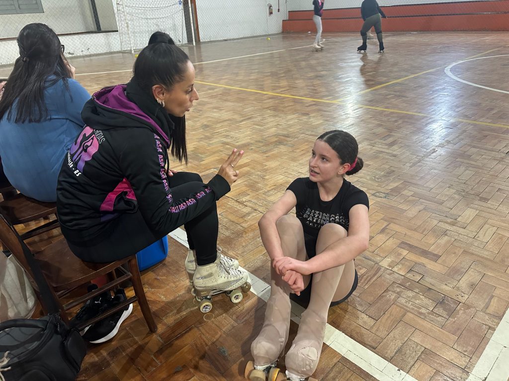 A professora explica que as provas do Campeonato Gaúcho de Patinação são divididas em diferentes modalidades. No livre, os atletas apresentam coreografias que incluem saltos e giros, sendo a categoria mais praticada pelos integrantes da Arte Sobre Rodas. O free dance prioriza a dança, com passos técnicos bem definidos. Já o solo dance exige que o patinador execute movimentos em locais específicos da pista, seguindo um trajeto determinado. Por fim, as figuras obrigatórias cobram a precisão na execução de desenhos e traçados sobre o piso.