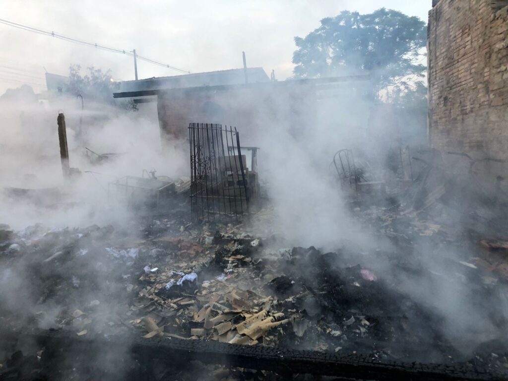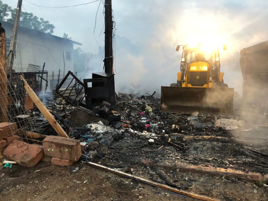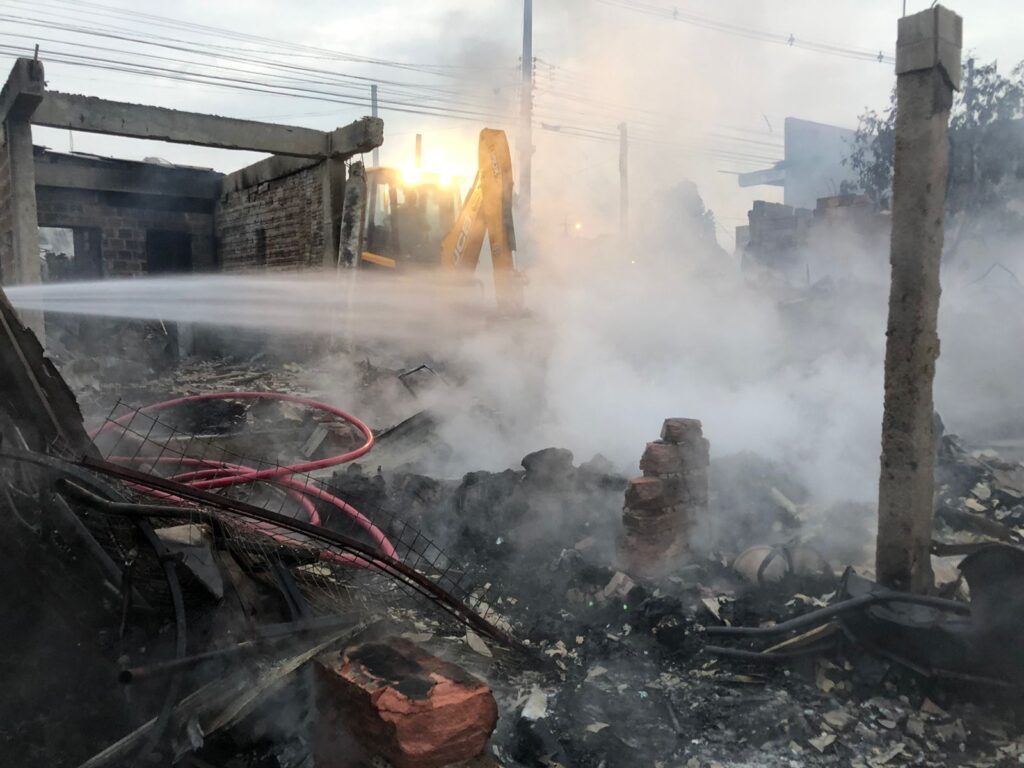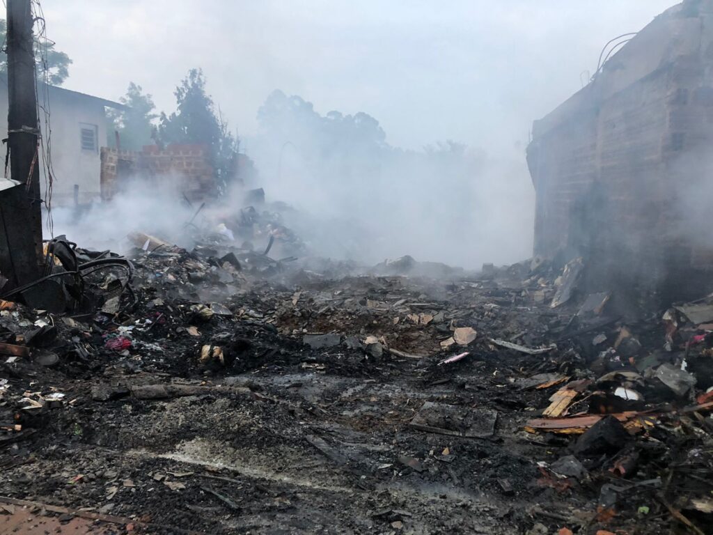 Rapidamente, as chamas se alastraram por todo o terreno, onde havia 10 imóveis, que serviam de moradia e também como depósito.