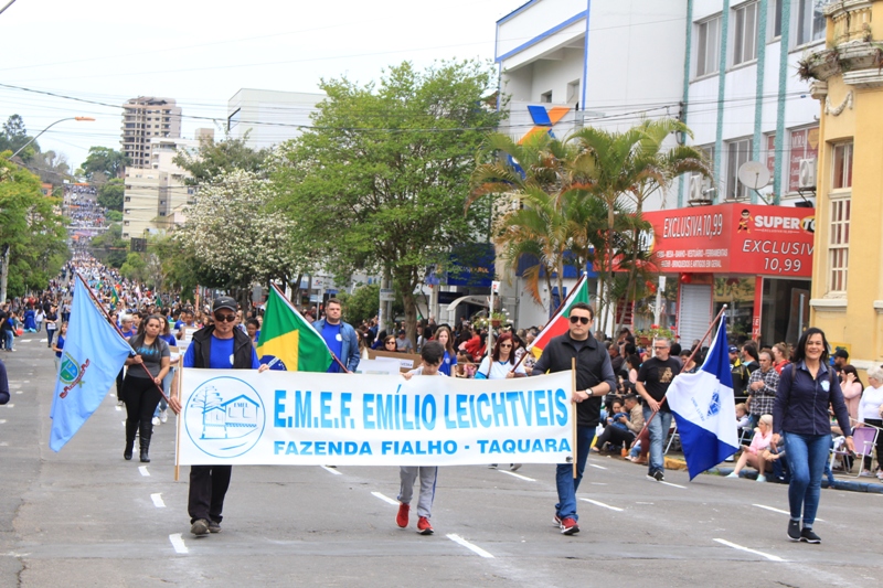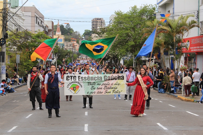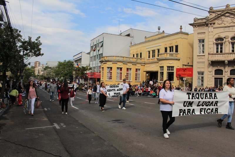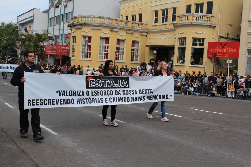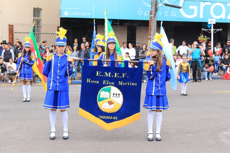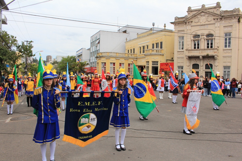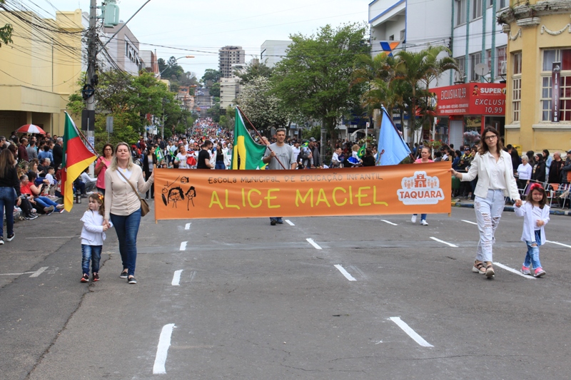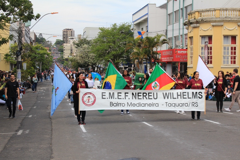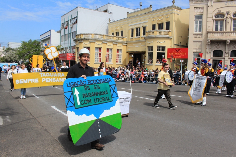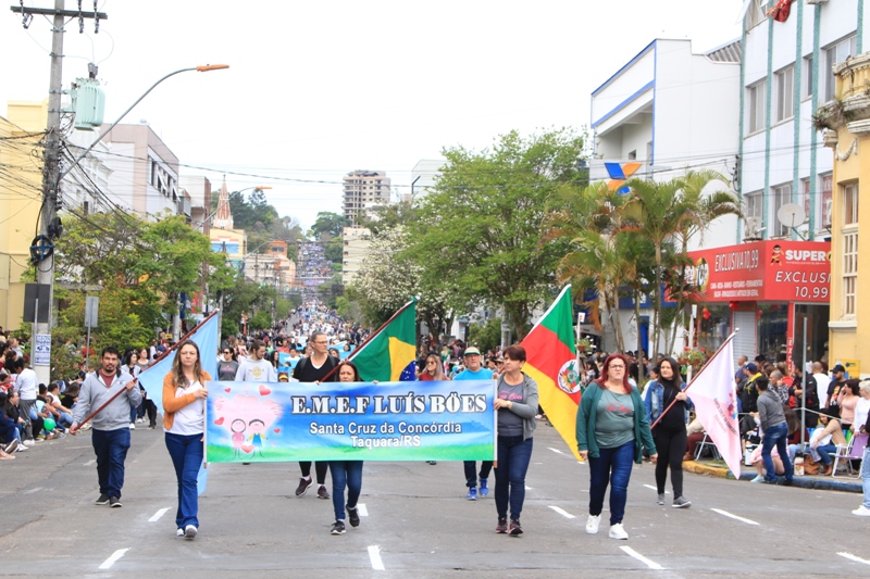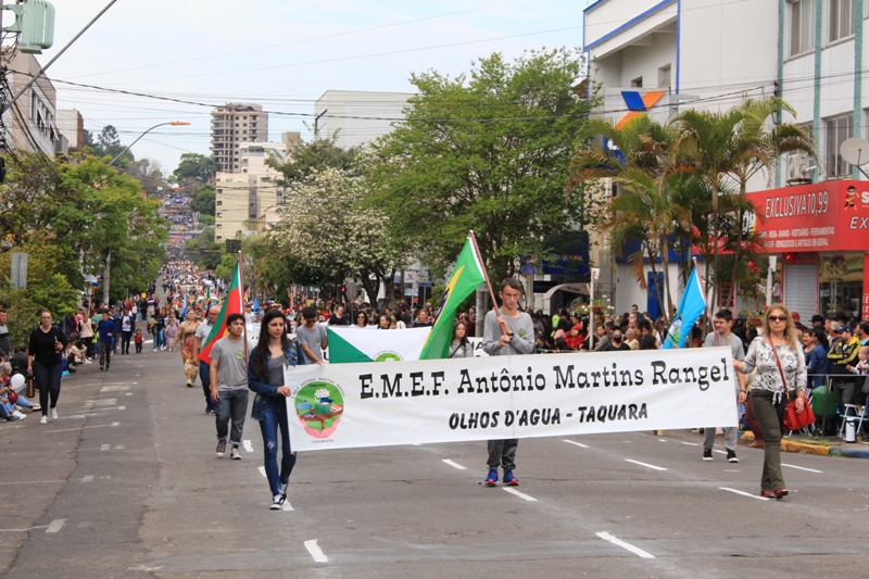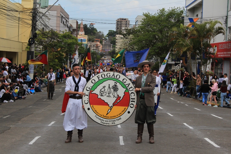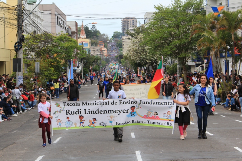 Após a abertura oficial do evento, que contou com a presença da prefeita Sirlei Silveira e outras autoridades municipais, o desfile teve início com a passagem dos veículos das forças de segurança de Taquara. Logo em seguida, os alunos, professores e funcionários das escolas das três redes de ensino do Município passaram pela Júlio de Castilhos, seguidos pelos representantes de entidades, como os Centros de Tradições Gaúchas (CTGs) de Taquara, Rotary Club, Lions Clube, ONG Vida Breve, Desbravadores, além das bandas marciais.