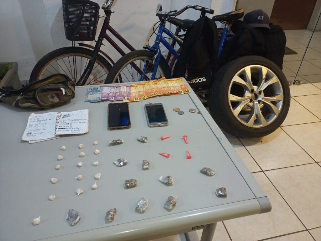 Na pochete largada ao chão foram encontrados quatro pinos de cocaína, 16 buchas de crack, 12 buchas de maconha, e uma quantia em dinheiro. No local também foram localizadas duas bicicletas e uma roda de carro com pneu, que foram aprendidas visto a denúncia relatar que usuários trocavam os objetos por drogas.
