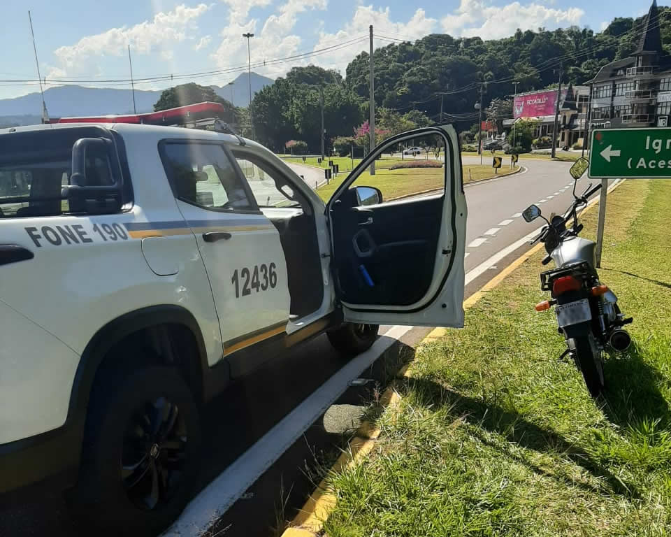 Na tarde de sábado (19/02), por volta das 15 horas, a Brigada Militar de Igrejinha recebeu informações de dois indivíduos em uma motocicleta cinza, em atitude suspeita, nas imediações do bairro XV de Novembro. Quando em patrulhamento naquele local, a guarnição visualizou uma motocicleta, placa de Campo Bom, com as características repassadas.