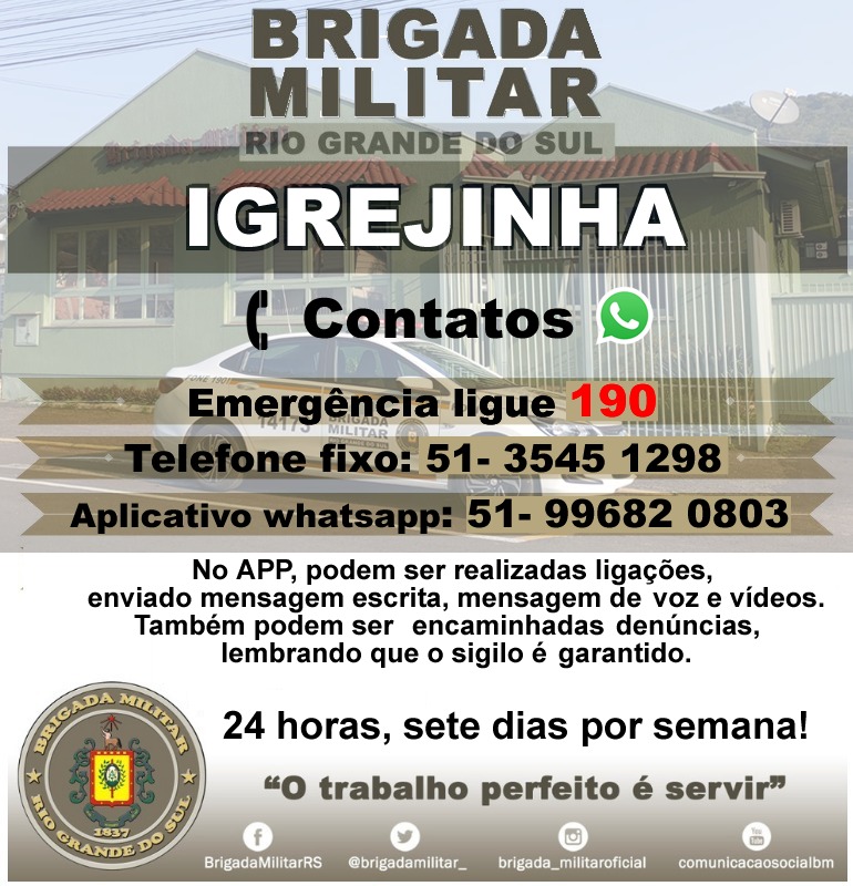 A Brigada Militar de Igrejinha, buscando ampliar as possibilidades de contato com a comunidade, divulgou os números dos telefones e de aplicativo, que estão à disposição da comunidade, visando a aproximação e agilidade para o atendimento de ocorrências. Os meios de contato estão disponíveis 24 horas por dia, sete dias por semana. Qualquer informação repassada a esses números também servem como canais de denúncias, onde o sigilo é garantido pela Brigada Militar.