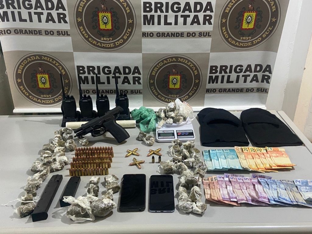 Durante a abordagem, os agentes encontraram com o suspeito uma pistola Bersa TPR9 calibre 9mm, 83 munições do mesmo calibre, um rádio transmissor configurado na frequência da corporação, três rádios comunicadores adicionais, duas toucas ninjas, 731 gramas de maconha, uma balança de precisão e a quantia de R$ 624,00 em espécie.