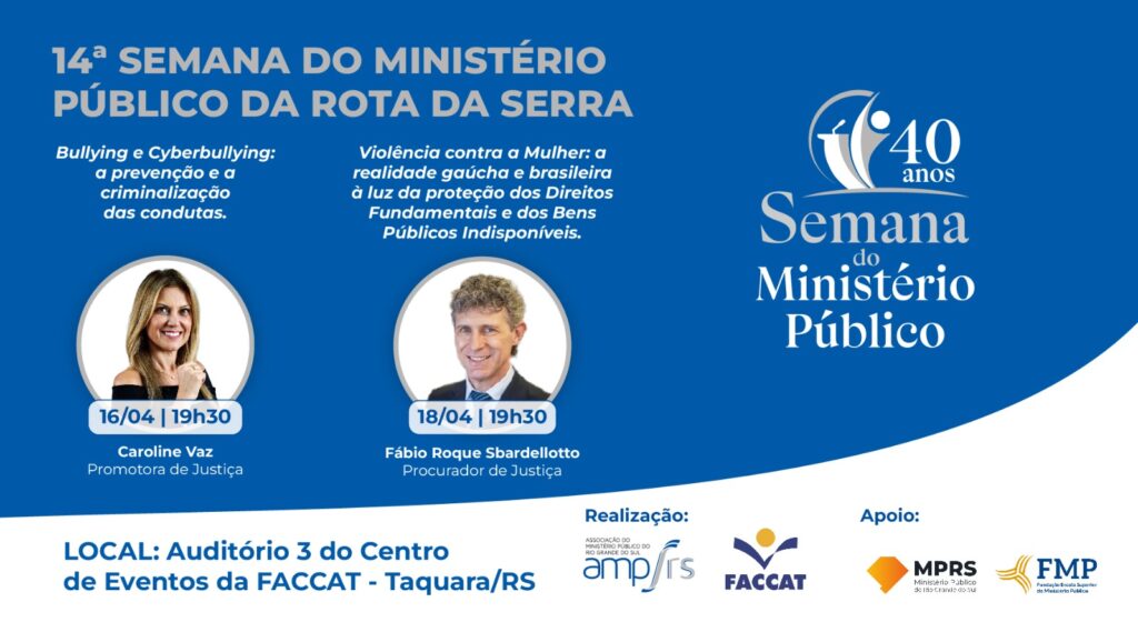 Programada para ocorrer nos dias 16 e 18 de abril, na sede das Faculdades Integradas de Taquara (Faccat), a 14ª Semana do Ministério Público da Rota da Serra terá como temas centrais o bullying, cyberbullying e violência contra a mulher. O evento contará com a participação especial dos renomados palestrantes Dra. Caroline Vaz, Promotora de Justiça do Estado do Rio Grande do Sul, e Dr. Fábio Roque Sbardellotto, Procurador de Justiça do Ministério Público.
