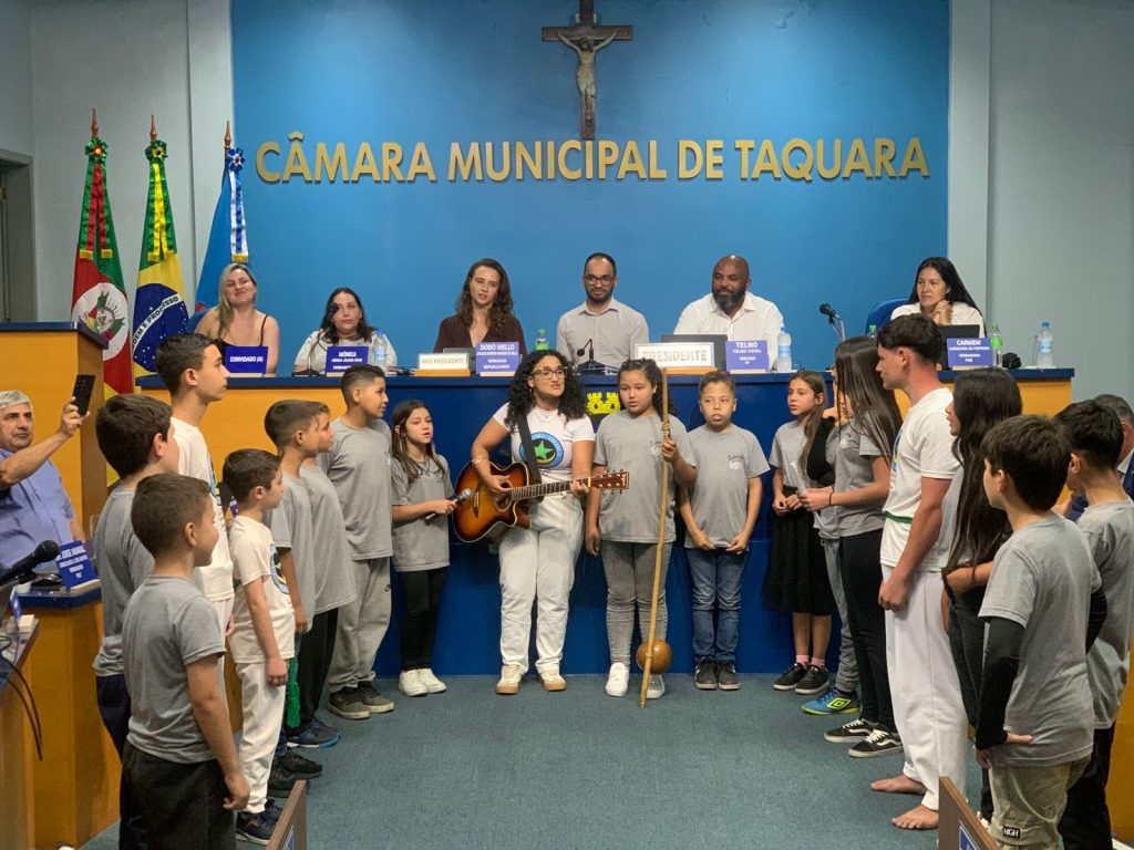 Abertura da sessão teve apresentação de estudantes da EMEF Zeferino (Foto: André Amaral/Rádio Taquara)