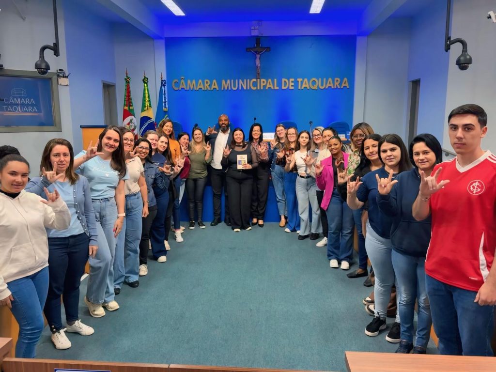 A Câmara de Vereadores de Taquara sediou, na manhã da segunda-feira (10), uma capacitação em Língua Brasileira de Sinais (Libras) por meio do projeto “A Tela da Inclusão”. A iniciativa tem como objetivo promover o ensino da Libras para jovens de 15 a 29 anos, oferecendo oficinas gratuitas, material didático impresso, certificação e atividades presenciais.