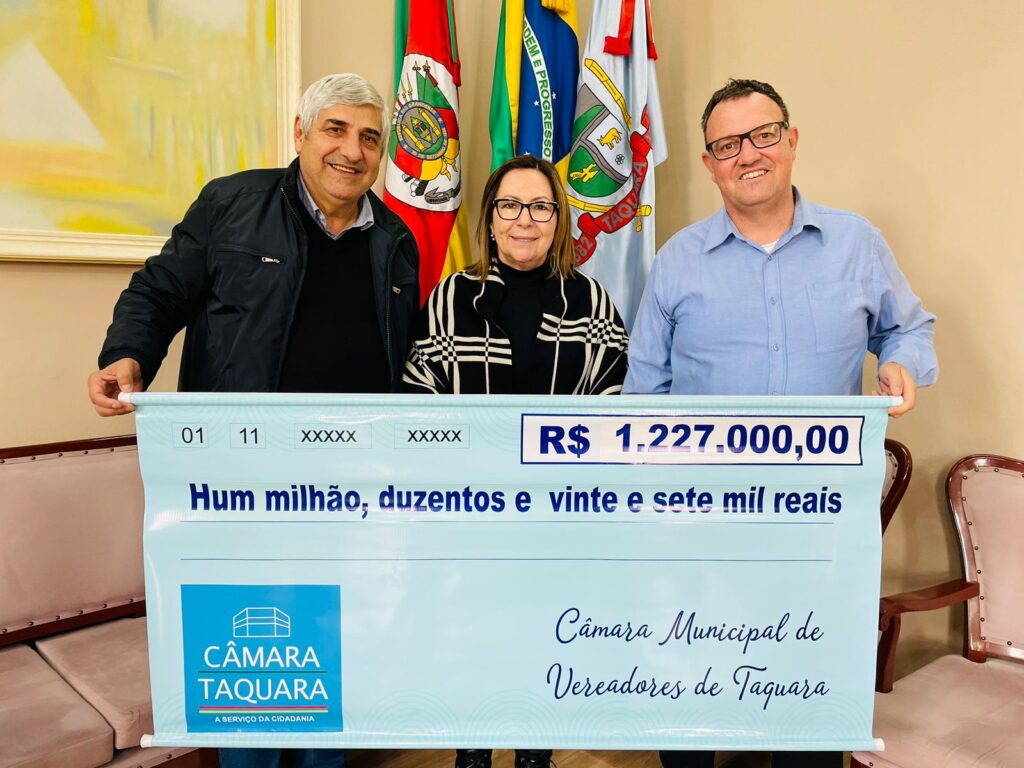 A Câmara de Vereadores realizou, nesta sexta-feira (28), a devolução de R$ 1.227.000,00 para a Prefeitura de Taquara, provenientes de economias da gestão do presidente do Legislativo, Marcelo Maciel. O recurso será utilizado para custeio na saúde, como pagamentos de profissionais e serviços e contrapartida para a ampliação do Hospital Bom Jesus.