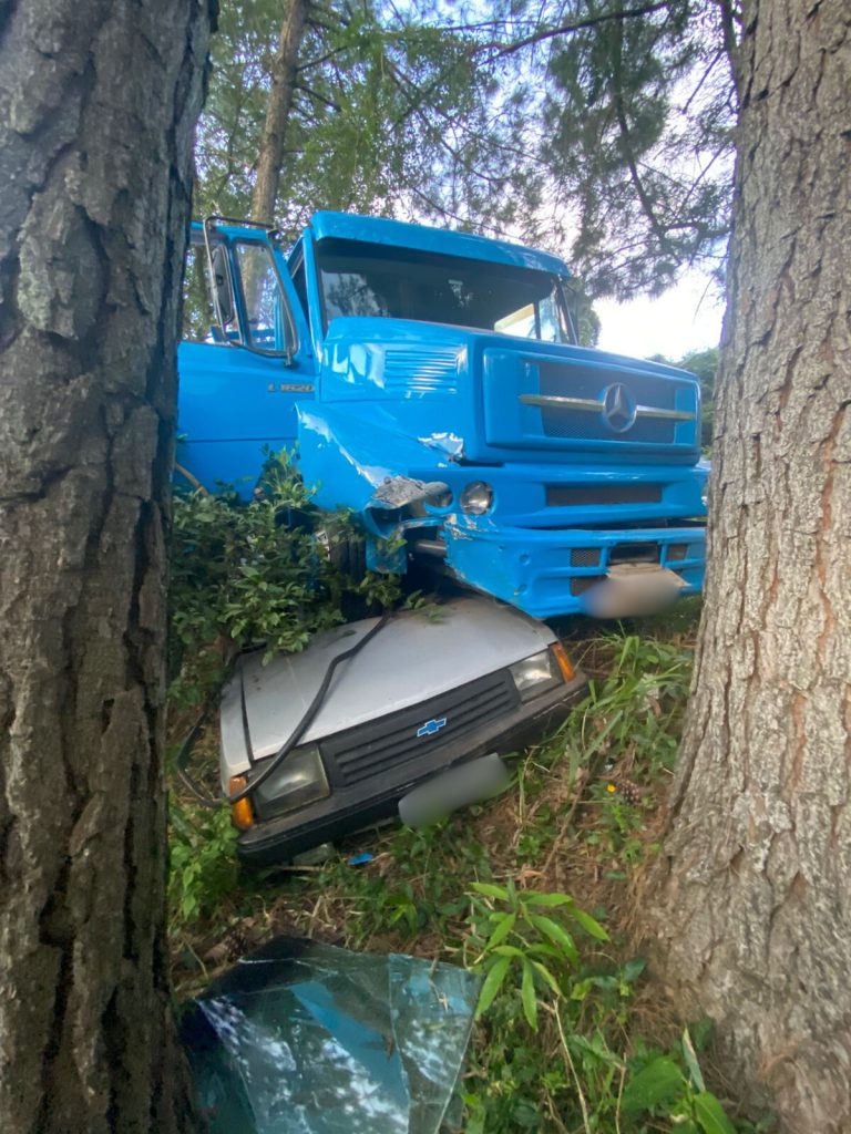 Um caminhão saiu da pista no km 17 da ERS-115, em Três Coroas, na tarde desta terça-feira (13), e acabou atingindo um carro que estava estacionado às margens da rodovia. De acordo com informações do Corpo de Bombeiros Voluntários de Três Coroas, não houve feridos no acidente, apenas danos materiais.