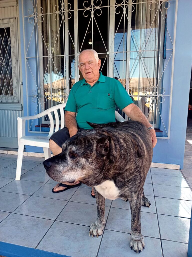 “Eu ganhei o Tigre do meu filho Newton e da minha nora Angélica, que moram aqui do lado de casa. Minha nora conhece muito sobre cães e foi ela quem foi buscar o filhote no Uruguai”, conta seu Nelson.