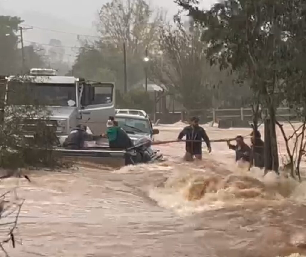 Casal e crianças se seguram em árvore após ponte cair no interior de Taquara – Veja vídeo do resgate