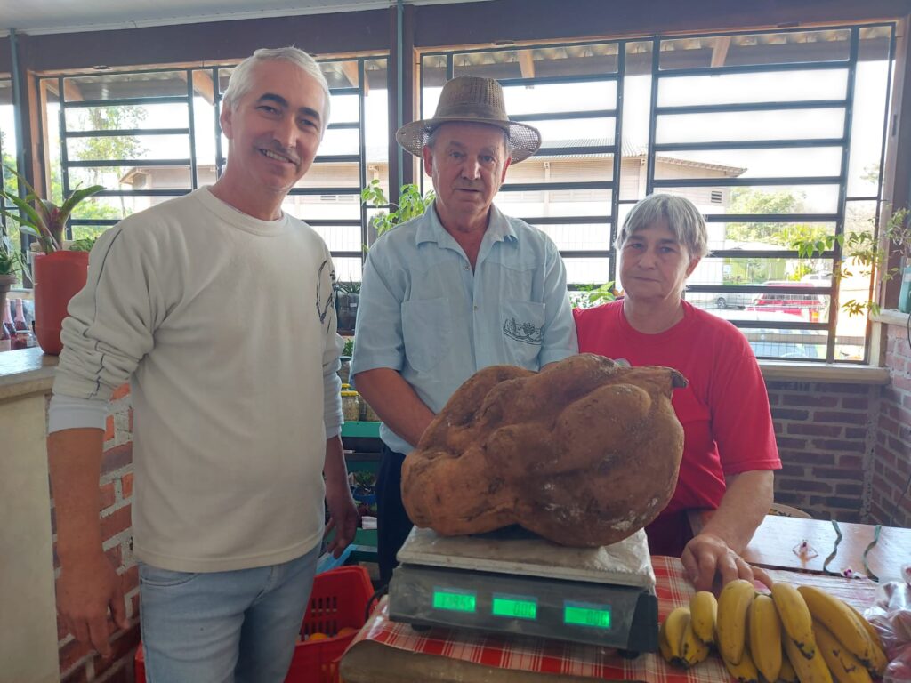 O casal de produtores rurais de Rolante, Paulo Reichert e Maria Madalena Reichert, da localidade de Canta Galo, levou para a Feira do Produtor, junto à Casa Rolante da Colônia, nesta sexta-feira, 4, uma batata doce gigante, de 14.865 kg (quase 15 quilos), que Maria colheu no dia 1° de agosto.