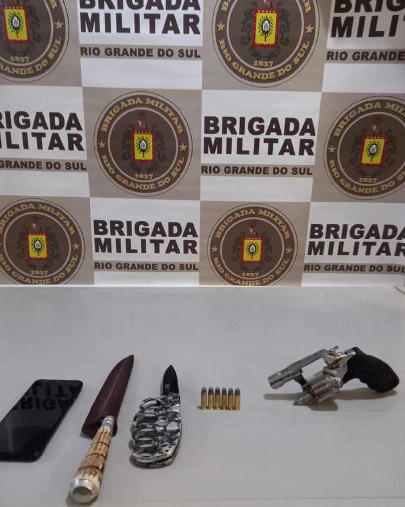 Conforme a BM de Parobé, na busca veicular foi localizado um revólver calibre 32, com numeração suprimida, municiado com seis munições. Durante busca pessoal, foi encontrado, na bolsa da mulher, uma faca e uma soqueira, objetos que ela relatou ter guardado para seu namorado.