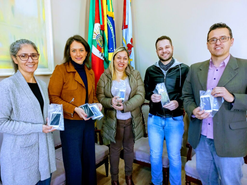 A entrega dos aparelhos celulares foi acompanhada pela assistente social da Smece, Karla Liane Gonzaga; pela secretária de Administração, Débora Costa; pelo secretário de Planejamento, Habitação, Segurança, Mobilidade e Trânsito, Luciano Campana, e pelo assessor jurídico, Junior Conrad.