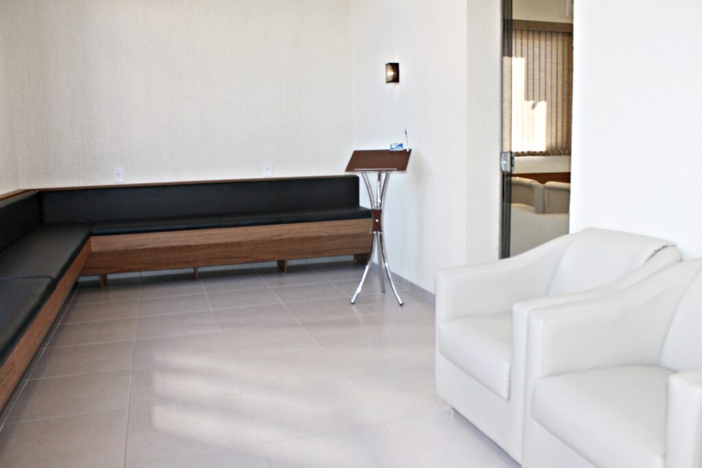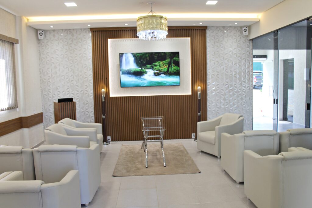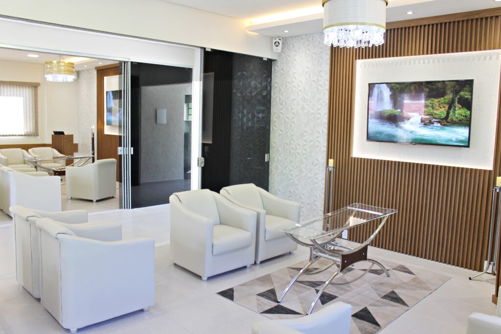 Além dos dois ambientes com as poltronas, e com paredes de vidro que podem ser abertas caso tenha muitas pessoas no local, o Cerimonial La Paz tem ainda uma recepção, com dois sofás maiores, banheiro e cozinha, e um amplo estacionamento nos fundos do prédio.