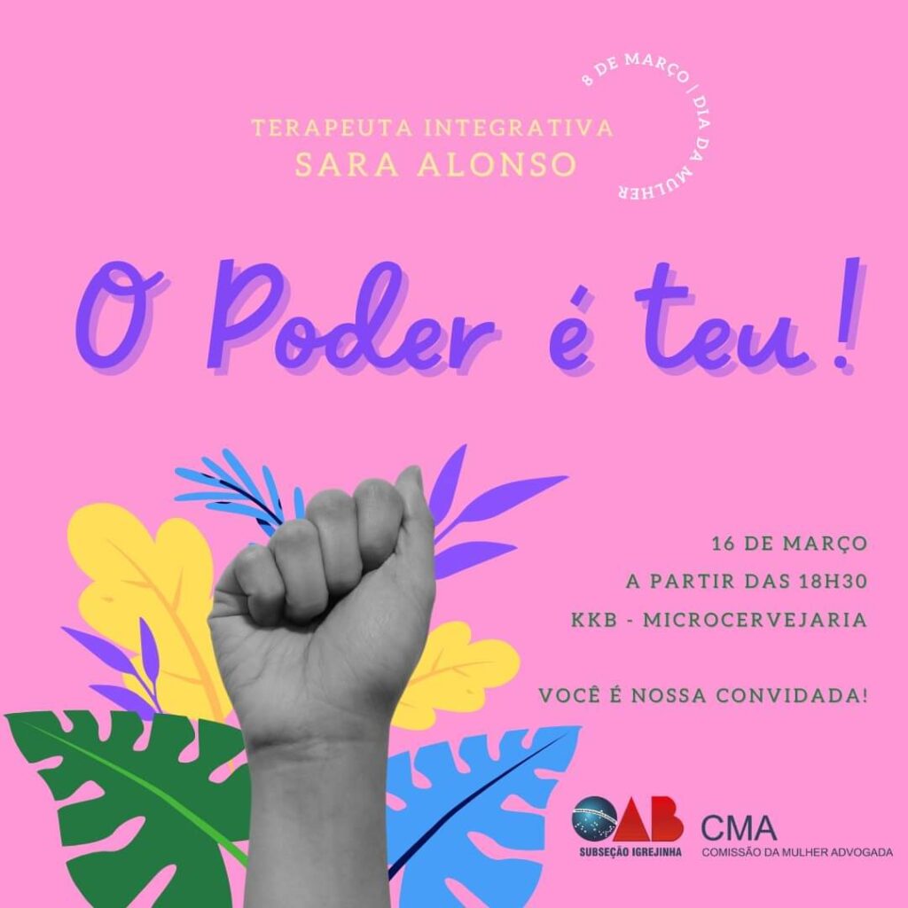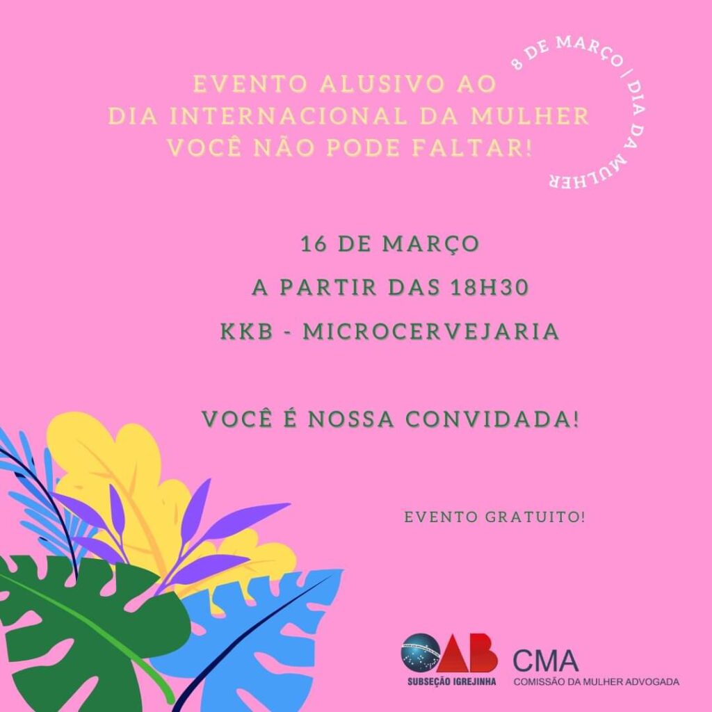 A Comissão da Mulher Advogada (CMA), da Ordem dos Advogados Brasileiros (OAB) – Subseção Igrejinha está organizando um evento, em homenagem às mulheres, alusivo ao Dia Internacional da Mulher, comemorado no último dia 08 de março. O encontro, que é gratuito para todas as mulheres, acontecerá nesta quarta-feira (16), a partir das 18h30min, na KKB Microcervejaria, localizada na Avenida Presidente Tancredo Neves, 12859, bairro Moinho, Igrejinha, junto ao local conhecido como ‘Posto do Christian’.