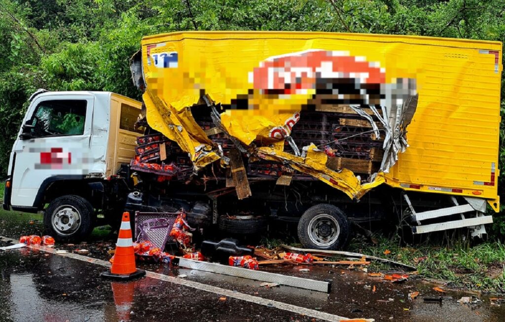 Após a colisão, os caminhões pararam na lateral da rodovia. O trânsito está lento no local, mas segue fluindo normalmente.
