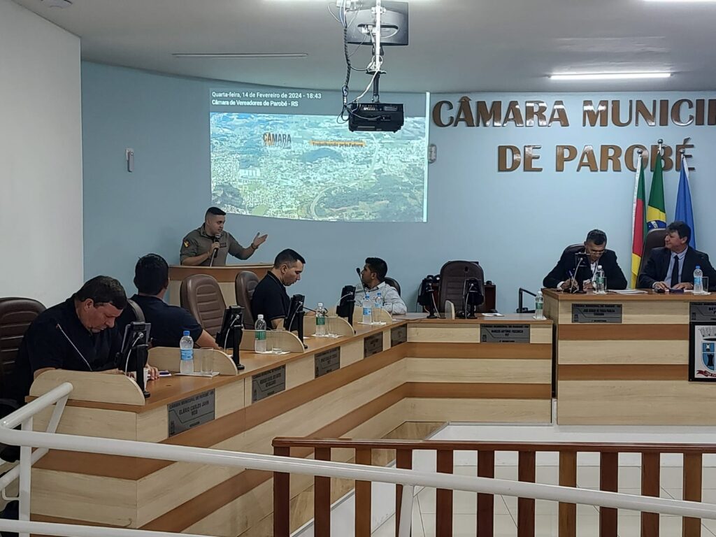 Nesta quarta-feira (14), a sessão ordinária da Câmara de Vereadores de Parobé contou com a presença do novo comandante da Brigada Militar (BM) do município, capitão Rodolfo Petrus Botassini. A convite do presidente do Legislativo, o vereador Betinho (PDT), capitão Petrus foi apresentado aos vereadores que ainda não o conheciam pessoalmente e também a comunidade em geral.