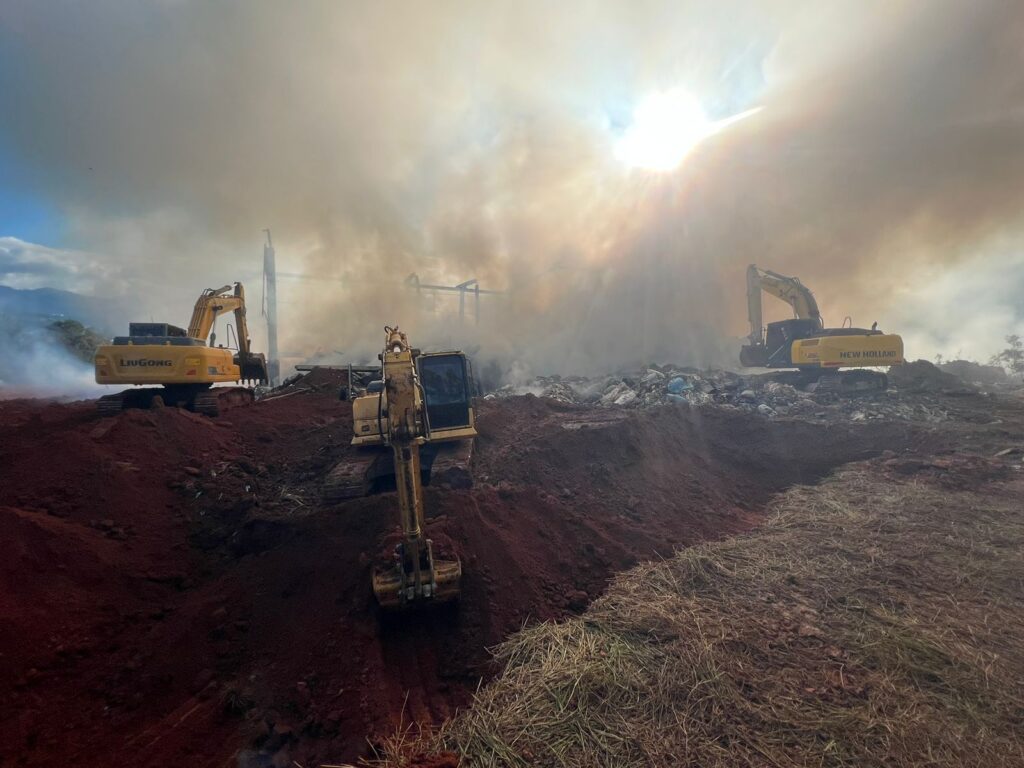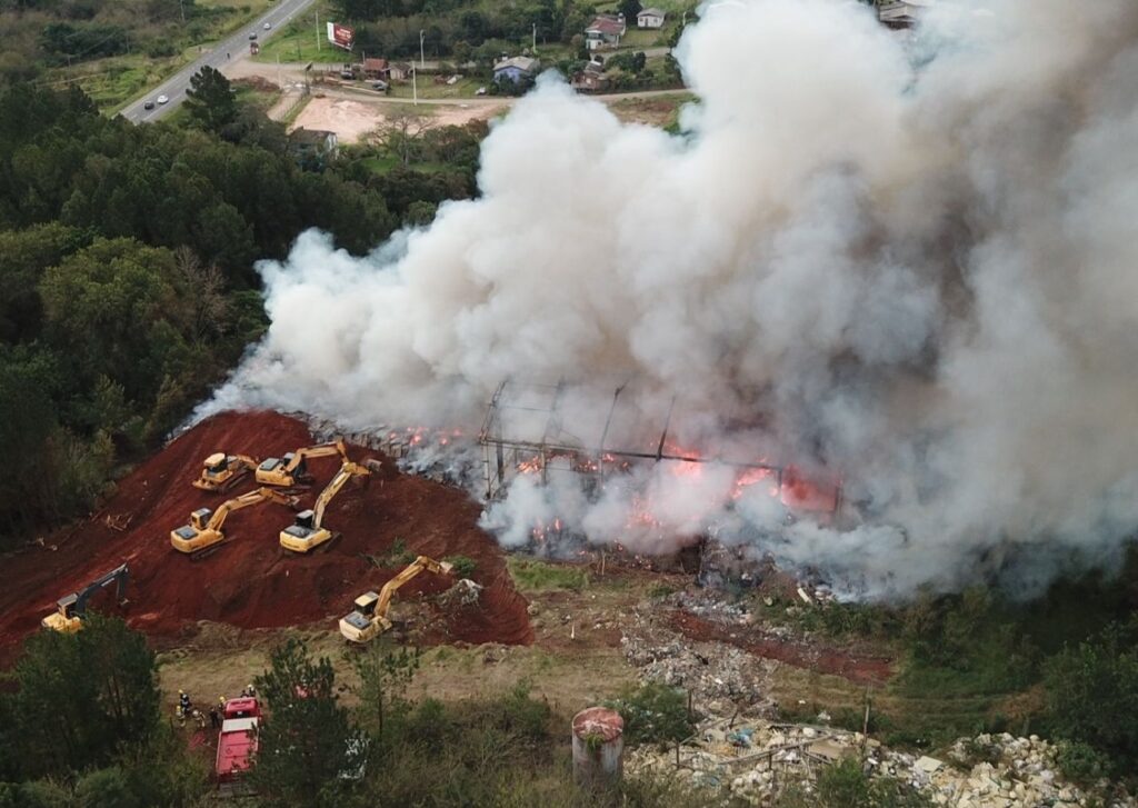 O trabalho de combate ao incêndio, que atinge um depósito de resíduos abandonado às margens da ERS-115, em Taquara, e teve início na manhã desta quarta-feira (26), já ultrapassou a marca das 24 horas. Os trabalhos ocorreram também durante a madrugada e são realizados pelo Corpo de Bombeiros Militar de Taquara, Secretaria de Obras e Serviços, Defesa Civil municipal, contando também com o apoio da Prefeitura de Igrejinha, que cedeu escavadeiras hidráulicas para os trabalhos.