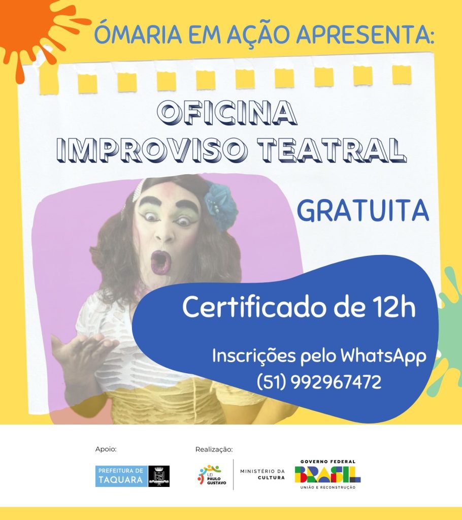 A Companhia “ÓMária do Teatro” dará início no próximo sábado (15), em Taquara, a uma oficina de improviso teatral completamente gratuita. A iniciativa acontece uma vez que a companhia teatral foi contemplada na Lei Paulo Gustavo, o que permitirá a todos os interessados uma oportunidade de se inserir no universo do teatro. A oficina terá encontros em seis sábados, tendo como público-alvo pessoas a partir dos 10 anos. As atividades ocorrerão no Centro Educacional Índio Brasileiro Cezar (antigo Cine Viena), das 14h às 16h.