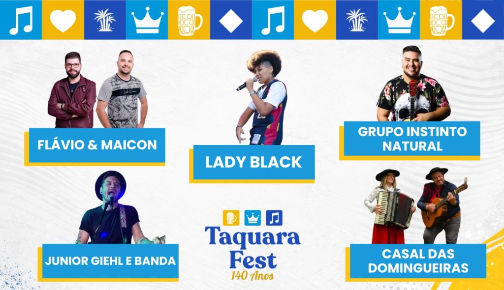A Prefeitura de Taquara definiu as cinco atrações locais que irão compor a programação do Taquara Fest 2026, evento que marca os 140 anos de emancipação. A comemoração será realizada no dia 17 de abril, com estrutura montada na região da Rua Coberta e programação ao longo do dia.