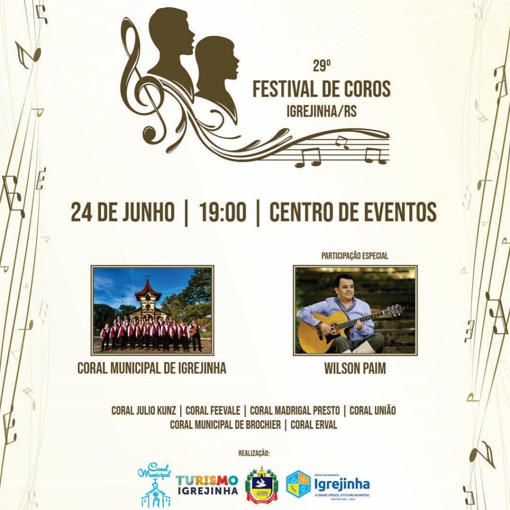 Acontece neste sábado (24), a partir das 19h, no Centro de Eventos Prefeito Selson Flesch, ocorrerá o 29° Festival de Coros, promovido pelo Coral Municipal de Igrejinha. Além do coral anfitrião, ocorrerá a apresentação dos corais: Julio Kunz, Feevale, Madrigal Presto, União, Municipal de Brochier e Erval. A noite contará ainda com a presença e apresentação do cantor tradicionalista Wilson Paim. A entrada é gratuita.