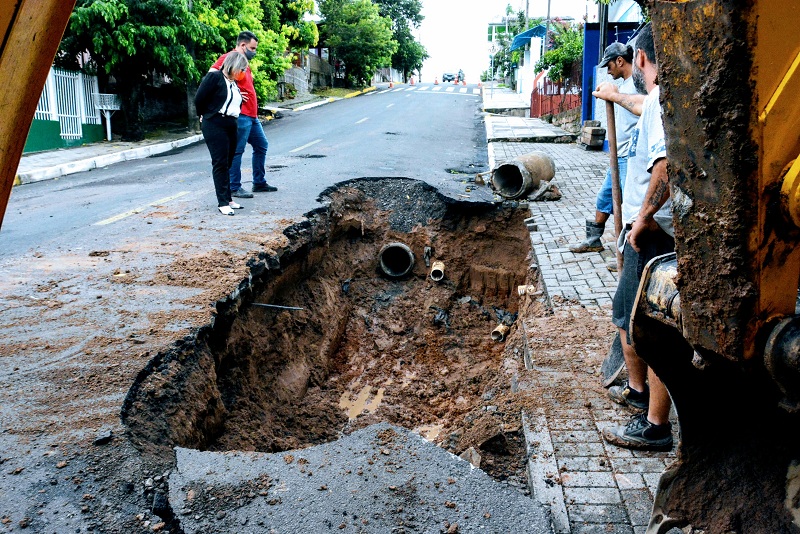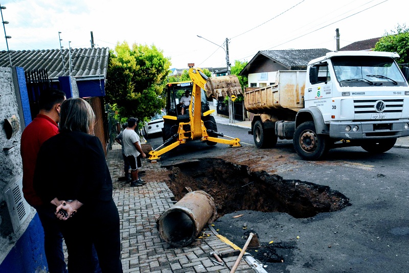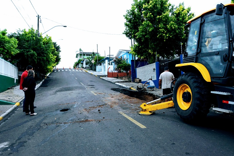 A forte chuva que chegou à região nesta semana provocou a cedência do asfalto na rua Peru, no bairro Empresa, em Taquara. A situação abriu uma cratera no local. A prefeita Sirlei Silveira acompanhou, nesta terça-feira (18), o trabalho da equipe da Secretaria de Obras e Serviços Urbanos, Mobilidade e Trânsito. Na ocasião, a prefeita fez críticas à forma como foram realizadas pavimentações asfálticas no município. “Vejam o que um trabalho mal feito pode ocasionar a nossa comunidade”, disse Sirlei, segundo nota do Executivo.