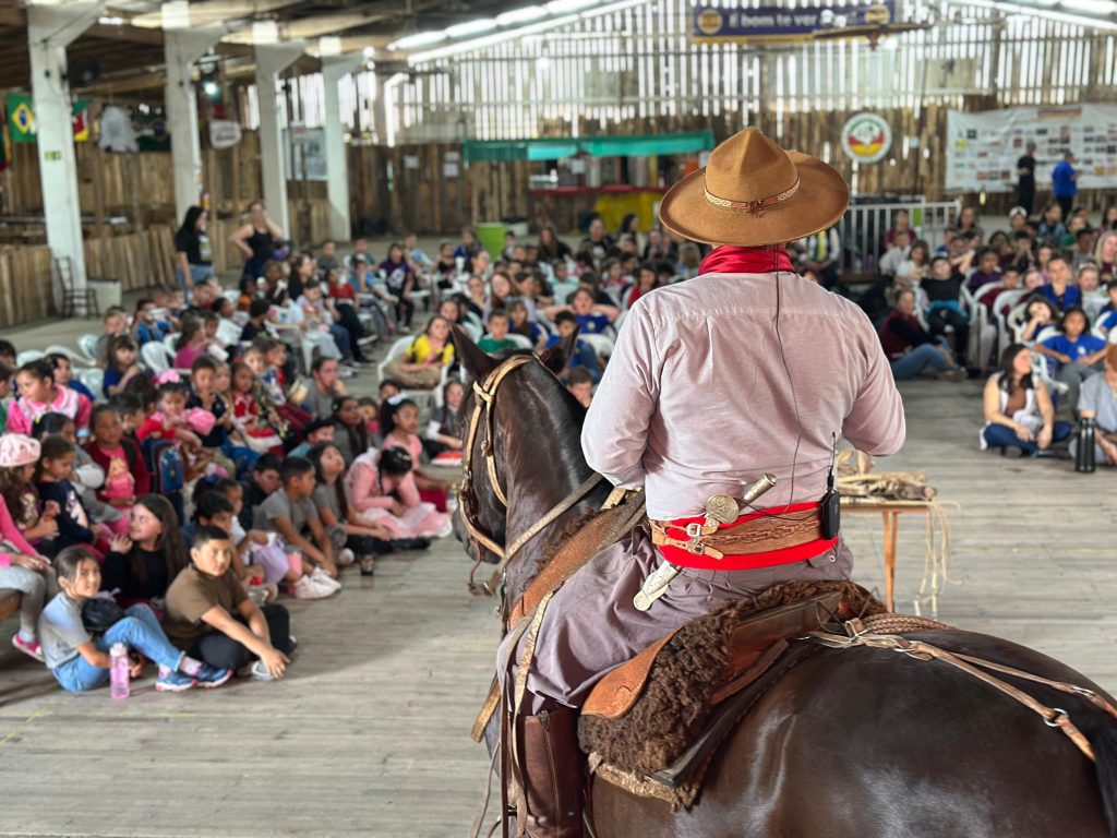 Na sequência, o domador Flávio Melo entrou a cavalo e declamou o poema “Paisano”, de Luís Menezes, em uma apresentação que chamou a atenção da gurizada. Em sua oficina, destacou a conexão entre o gaúcho e o cavalo, comparando-a à mitologia do centauro, como se o animal fosse uma extensão da identidade campeira.