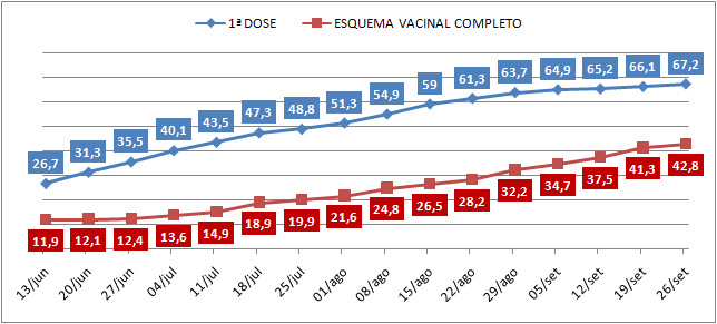 Levantamento realizado neste domingo (26/9) pela Rádio Taquara junto aos números do governo do Estado mostra que o Vale do Paranhana aplicou, na última semana, mais 6.458 doses de vacinas contra a Covid-19. Com isso, a região alcançou a aplicação de 206.151 doses, sendo 124.124 da primeira injeção; 76.773 da segunda dose; 4.797 de dose única; e 458 da dose de reforço. Segundo os números, 67,2% da população está imunizada com a primeira dose e 42,8% já completou o esquema vacinal, com a segunda imunização ou a dose única.