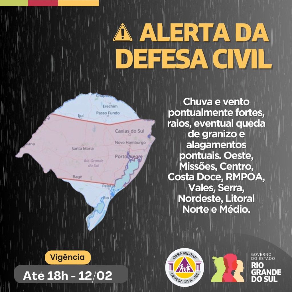 A Defesa Civil do Rio Grande do Sul emitiu um alerta para a possibilidade de temporais atingirem diversas regiões do estado até as 18h desta quarta-feira (12). Segundo o órgão, há previsão de chuva e vento pontualmente fortes, além de raios, eventual queda de granizo e alagamentos pontuais.