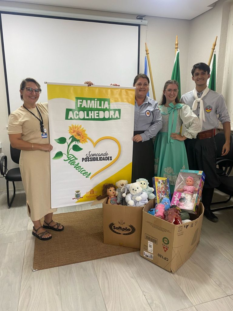 Na última sexta-feira (14), a Coordenadoria da 22ª Região Tradicionalista (22ªRT) realizou a entrega de brinquedos ao Serviço de Acolhimento em Família Acolhedora, vinculado à Secretaria de Desenvolvimento Social, Trabalho e Cidadania de Taquara. Os itens foram arrecadados durante o 2º Jantar de Integração da 22ªRT, promovido no final do ano passado no CTG Sentinela da Tradição, em Igrejinha.