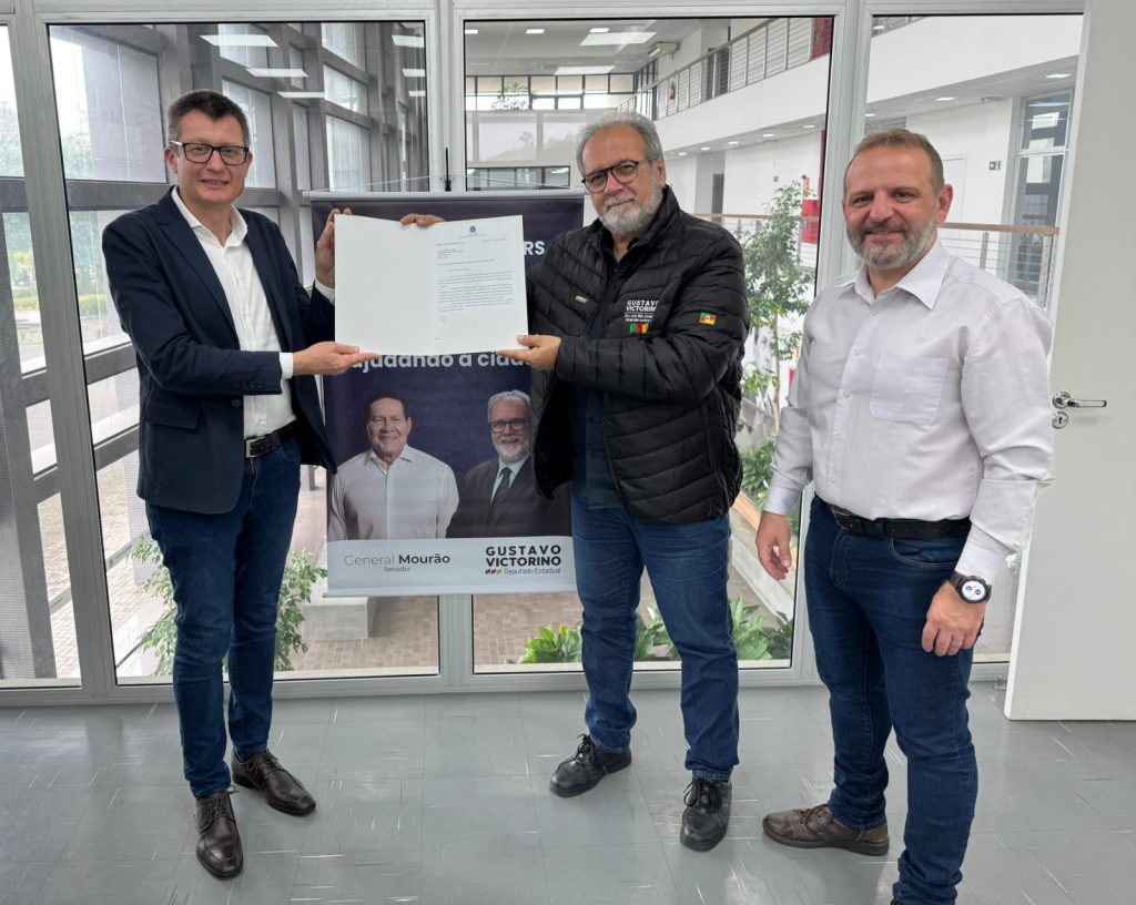 O deputado estadual Gustavo Victorino (Republicanos) esteve em Igrejinha nesta sexta-feira (22), para entregar ao prefeito Leandro Hörlle e ao vice-prefeito Juliano Müller, a indicação da emenda parlamentar do senador Hamilton Mourão que destina R$ 500 mil para a área da saúde e R$ 400 mil para a revitalização da Casa de Pedra do município.