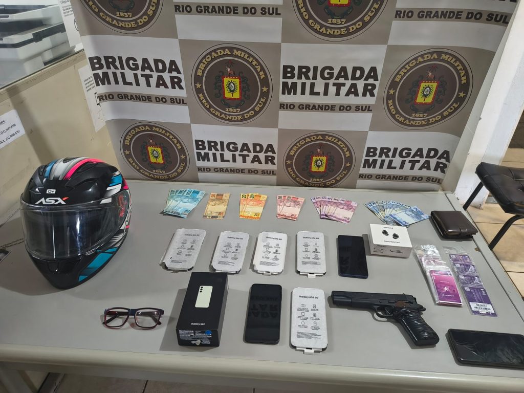 Conforme a Brigada Militar, a dupla utilizava uma motocicleta com placa adulterada durante o crime. Um dos homens portava uma arma, posteriormente identificada como simulacro. Ao todo, foram recuperados sete celulares, uma carteira e dinheiro levados mediante grave ameaça.